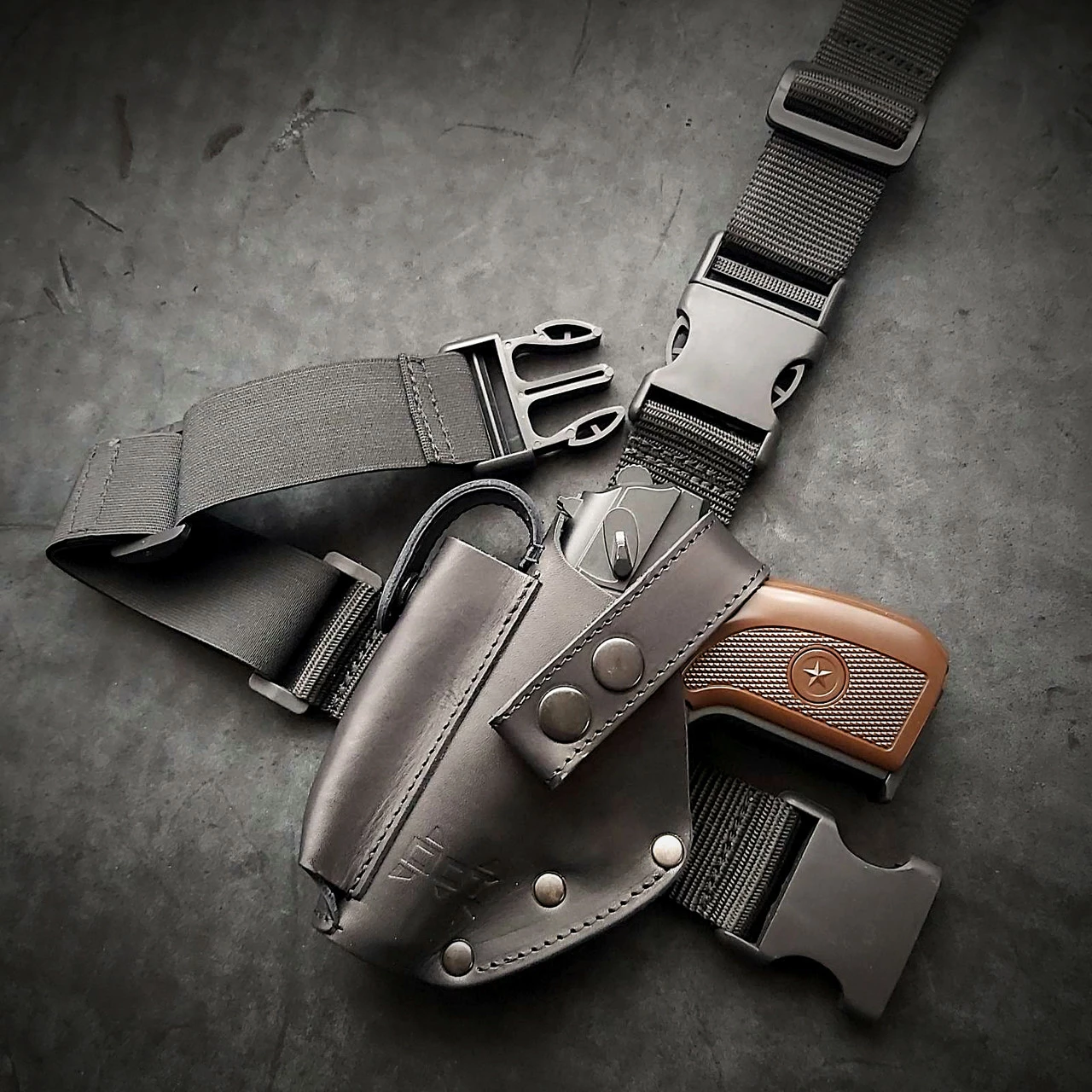 Кобура на стегно, шкіряна, під ПМ. Для шульги! Виконана із натуральної шкіри. Кобура зі шкіри завтовшки 2.2 мм. Кобура не знімна, пришита до системи стегна. Стропа, гумка, фастекси міцні. Ширина фастексів 4 см Кобура регулюється по вертикалі та горизонталі. Чи не бовтається, сидить щільно. Виробництво Україна, робимо під праву та ліву руку. Колір чорний