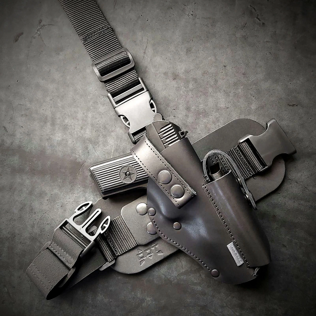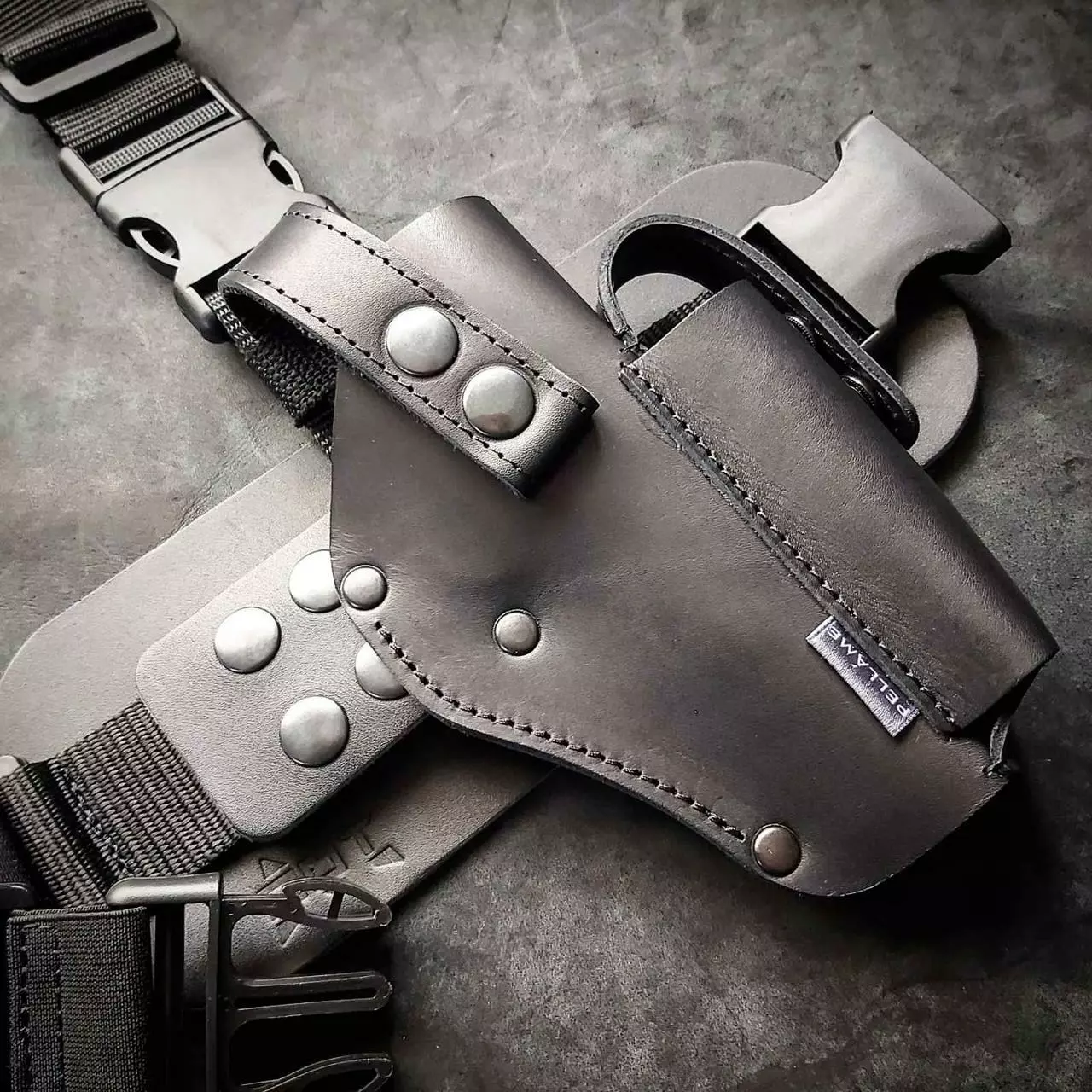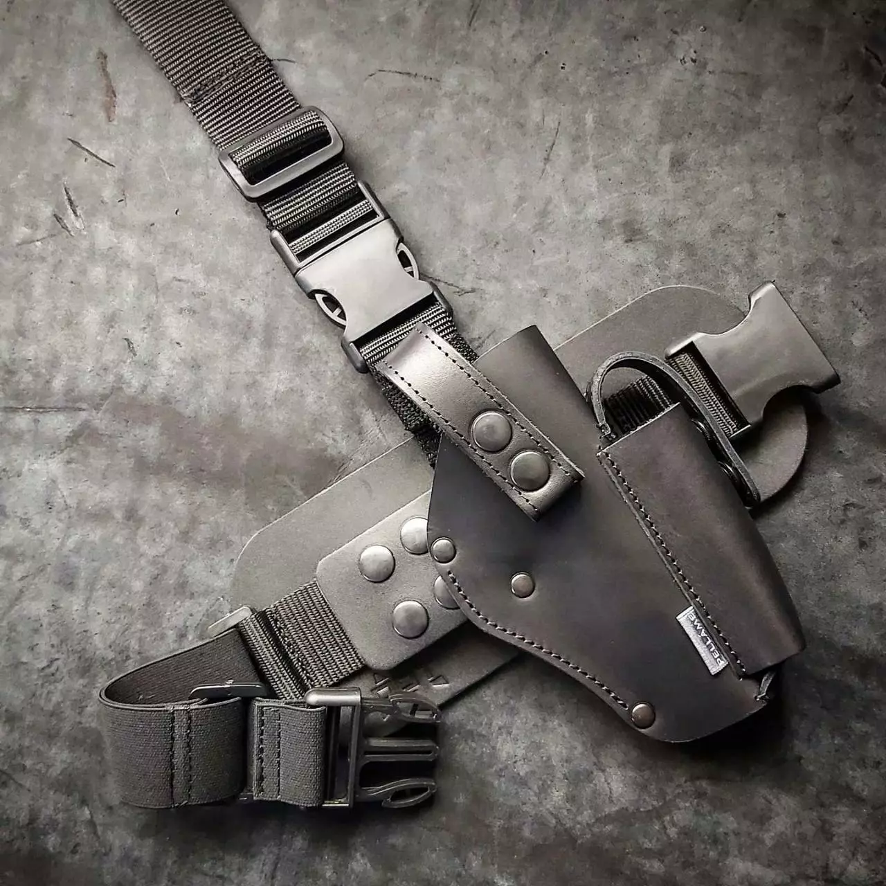 Шкіряна стегна кобура під ТТ. Колір чорний. Виконана із натуральної шкіри. Кобура знімається і можна носити на ремені. Кріплення на ремінь 5 см завширшки. Підкладка фіксується на стропі зверху та на гумці збоку. Стропа, гумка, фастекси міцні. Ширина фастексів 4 см Підкладка регулюється по вертикалі та горизонталі. Кобура не бовтається, сидить щільно. Виробництво Україна, робимо під праву та ліву руку