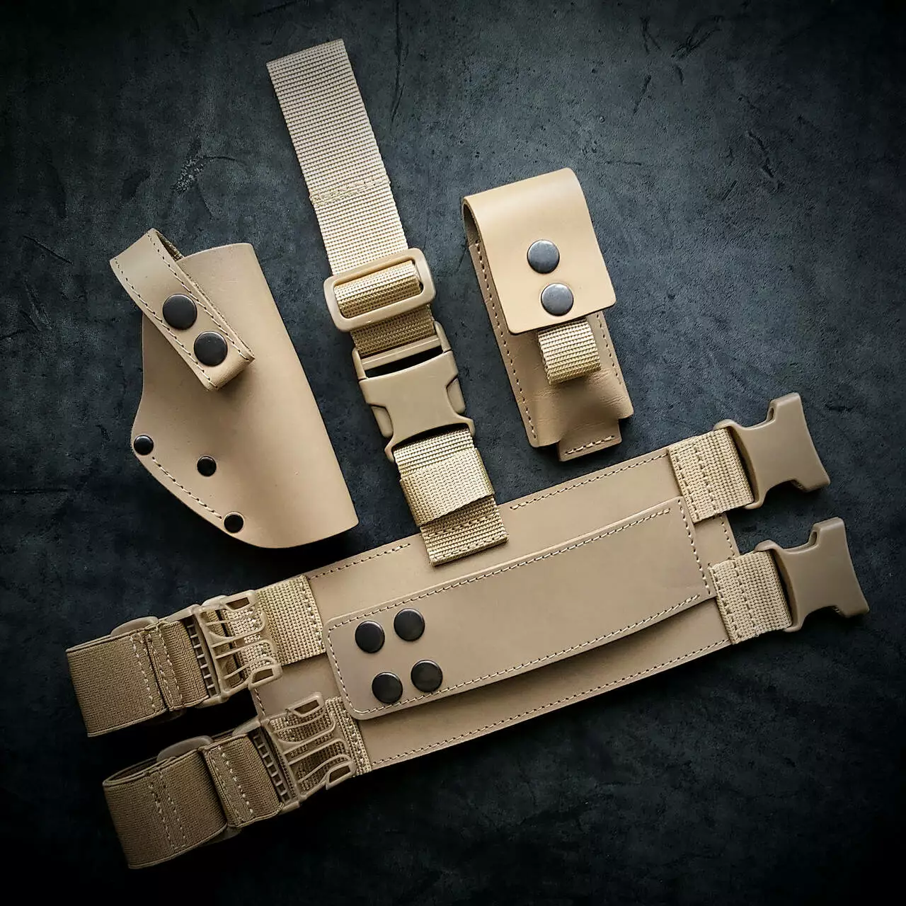 - Виконана із натуральної шкіри. Кобура та паучер зі шкіри завтовшки 2.5 мм, підкладка з ремінної шкіри 3.5 мм завтовшки.