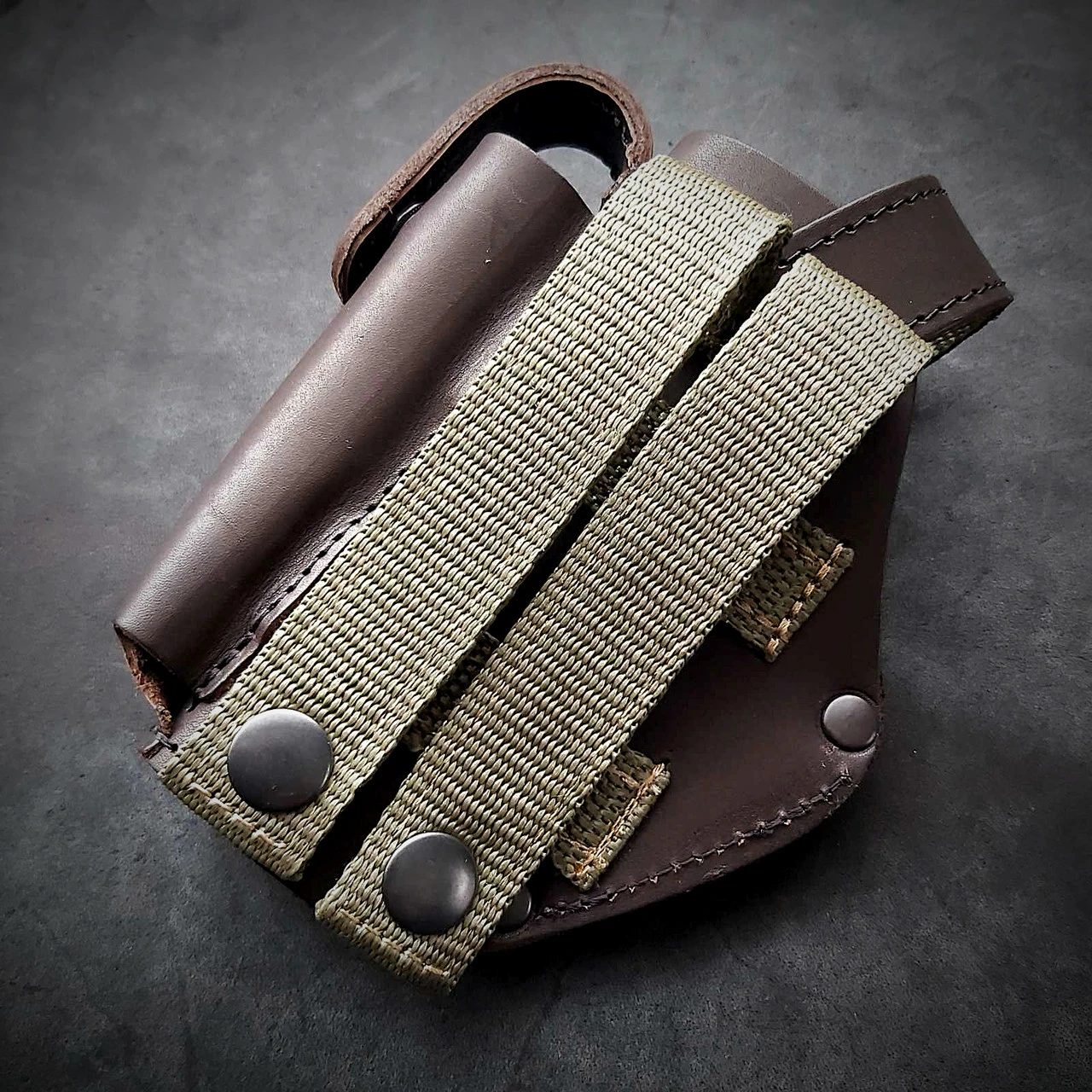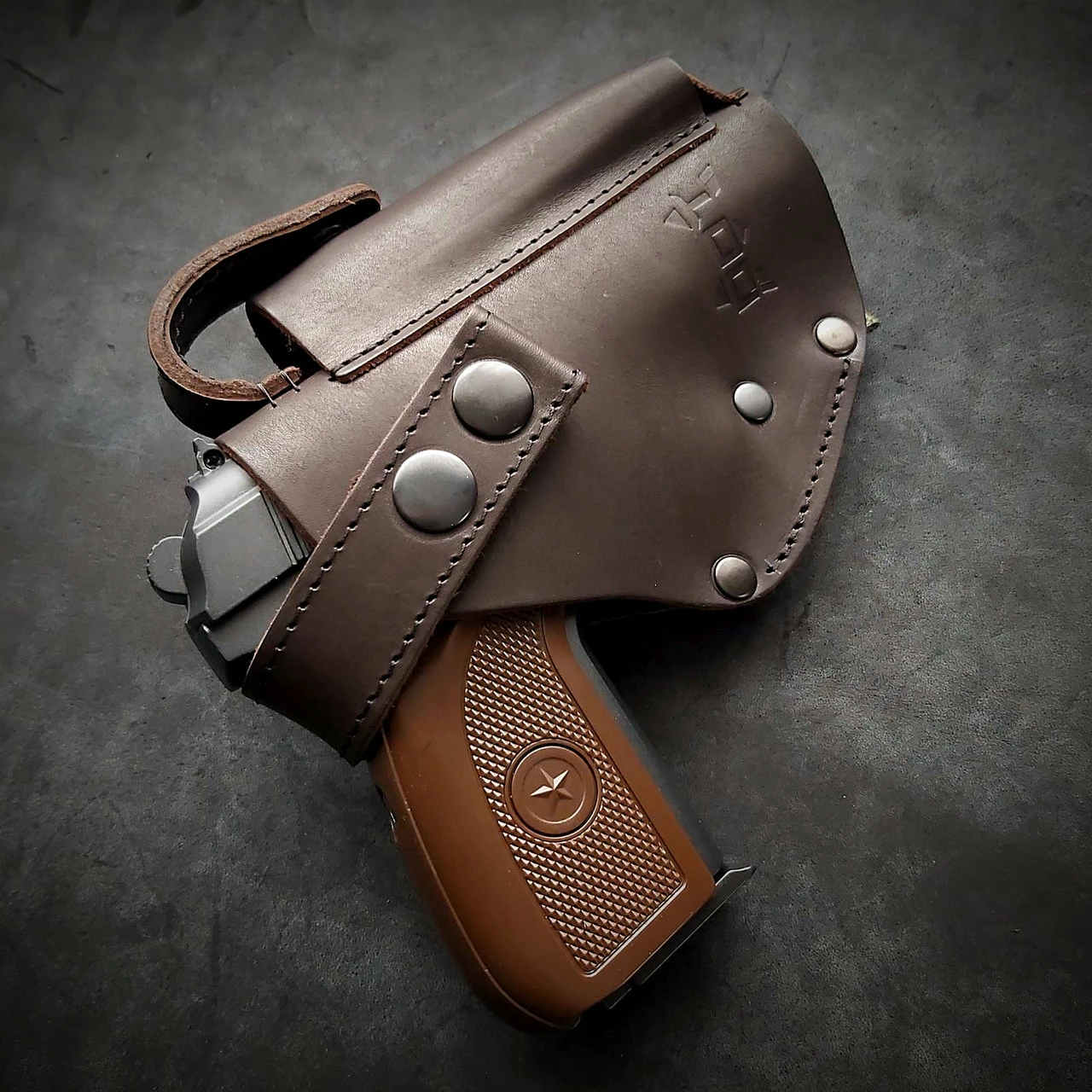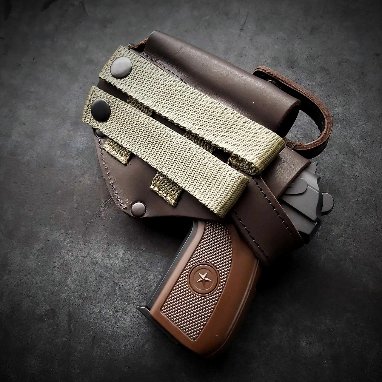 Кобура під ПМ. Виконана із щільної шкіри 2.5 мм завтовшки Пістолет та магазин фіксуються на кнопках. Кріпиться на систему MOLLE. Колір коричневий Виробник Україна. Робимо під праву та ліву руку!