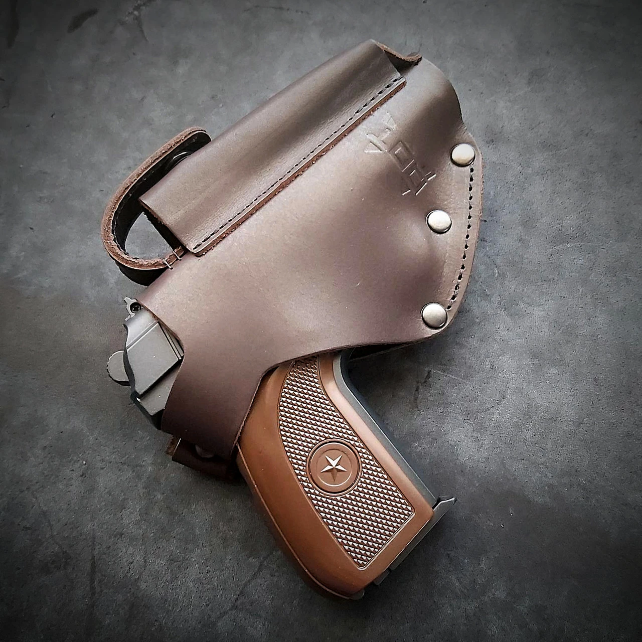 Кобура поясна під ПМ. Виконана із щільної натуральної шкіри. Колір коричневий Пістолет та магазин фіксуються на кнопках. Кріпиться на ремінь за допомогою скоби, а також простягнувши ремінь крізь отвір. Підходить під ремінь 5 см завширшки Скоба міцна металева Виробник Україна