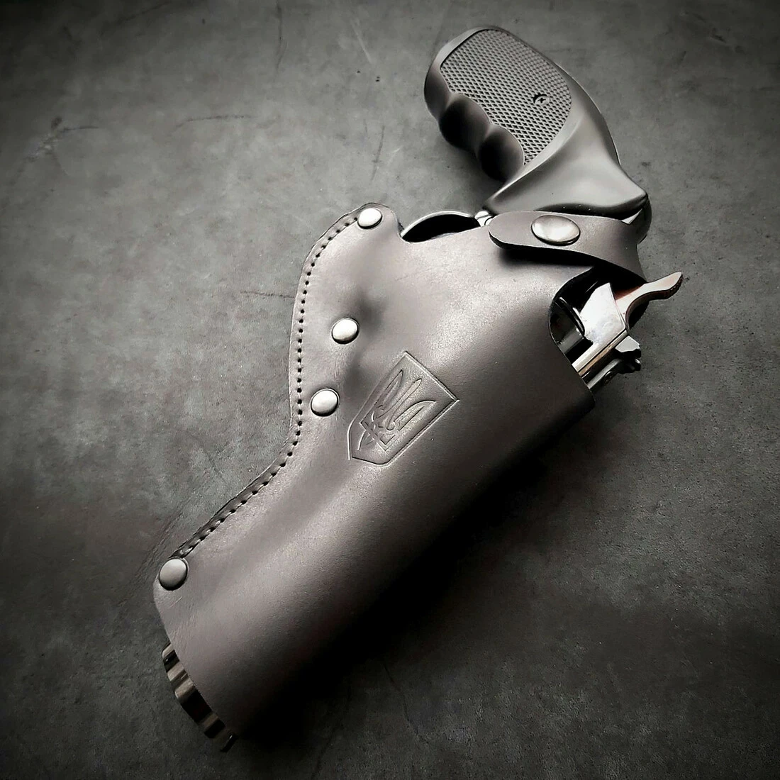 Кобура поясна під Револьвер Флобера 4 з тисненням герб України Виконана із натуральної щільної чорної шкіри. Фіксація пістолета на кнопці, під ремінь 5 см завширшки Виробництво Україна