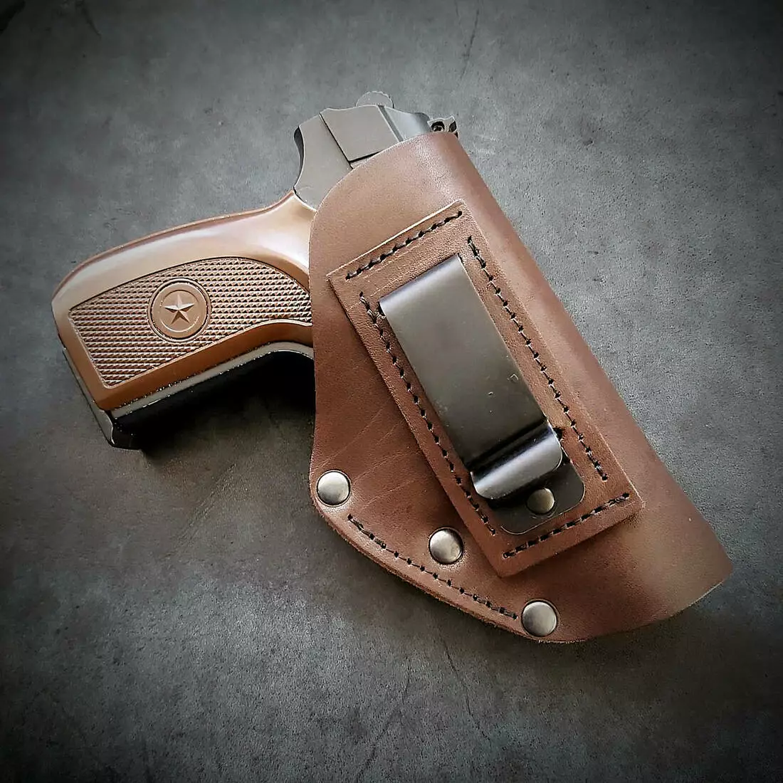 Кобура 2 в 1: поясна/прихованого носіння під ПМ. Підходить під праву та ліву руку (три варіанта носіння). Виконана із щільної шкіри 2.5 мм завтовшки. Колір коричневий Кріпиться за штани за допомогою скоби (для прихованого носіння), а також простягнувши ремінь крізь отвір. Підходить під ремінь 5 см завширшки Скоба міцна металева Виробник Україна