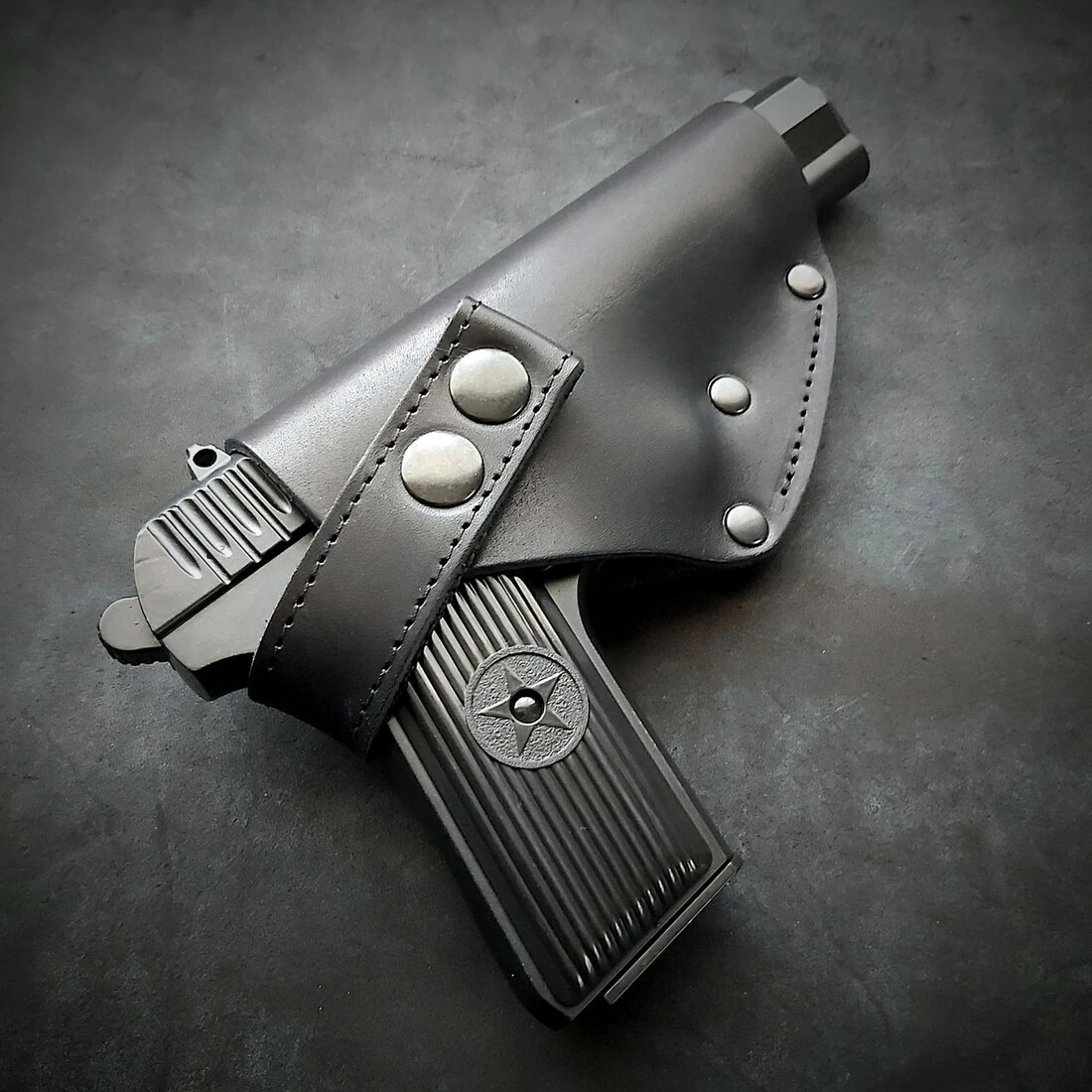 Кобура поясна, шкіряна під ТТ. Виконана із щільної шкіри 2.5 мм завтовшки. Колір чорний Пістолет фіксується на кнопках. Кріпиться на ремінь 5 см завширшки Виробник Україна. Робимо під праву та ліву руку!