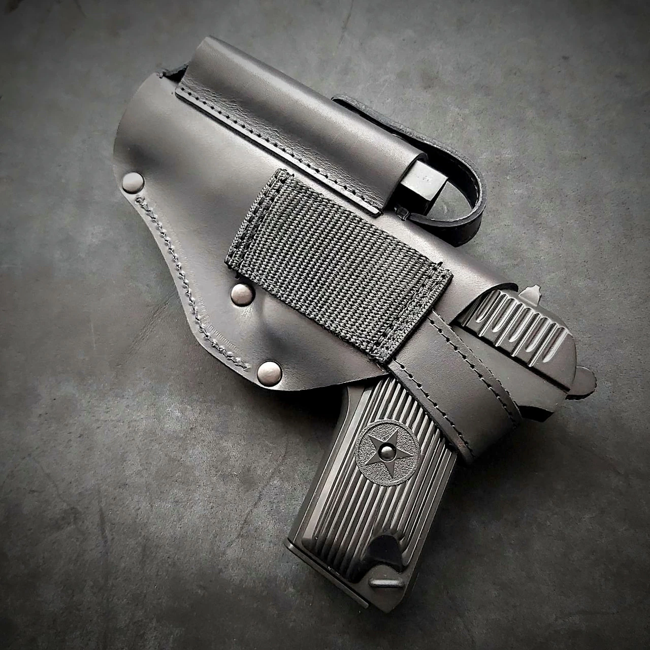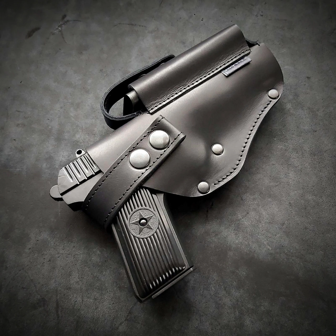 Кобура поясна, шкіряна під ТТ. Виконана із щільної шкіри 2.5 мм завтовшки. Колір чорний Пістолет та магазин фіксується на кнопках. Кріпиться на ремінь 5 см завширшки Виробник Україна. Робимо під праву та ліву руку!