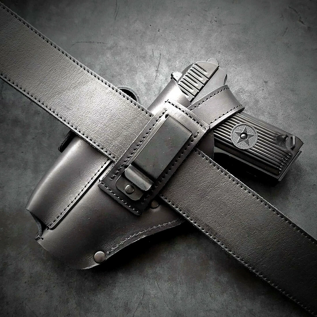 Кобура поясна, шкіряна під ТТ. Виконана із щільної шкіри 2.5 мм завтовшки. Колір чорний Пістолет та магазин фіксуються на кнопках. Кріпиться на ремінь 5 см шириною на скобу або простягнувши ремінь крізь отвір Виробник Україна. Робимо під праву та ліву руку!