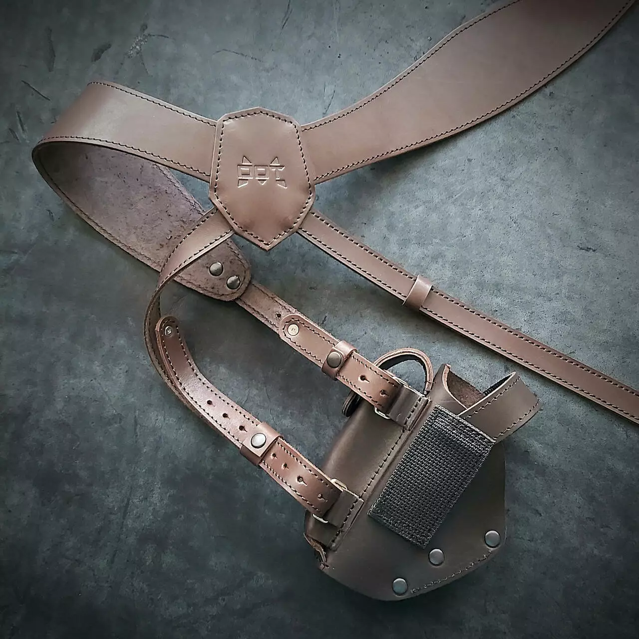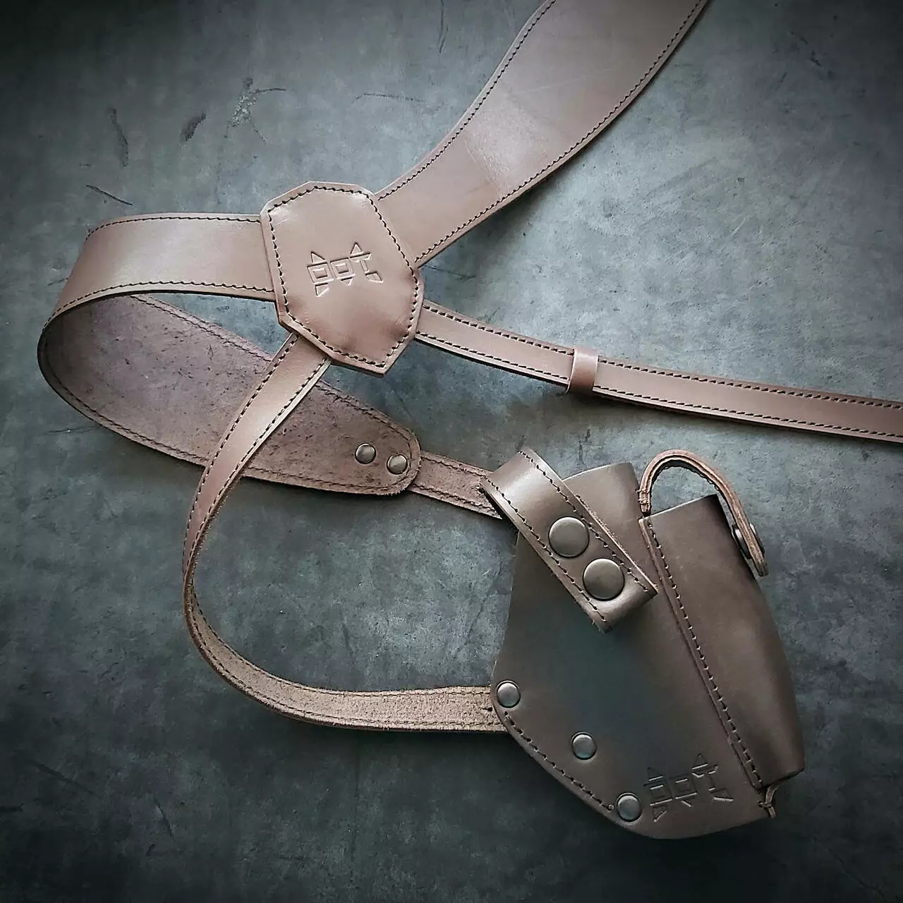 - Кобура до наплічної системи кріпиться на кобурних болтах. Пістолет фіксується на двох кнопках.