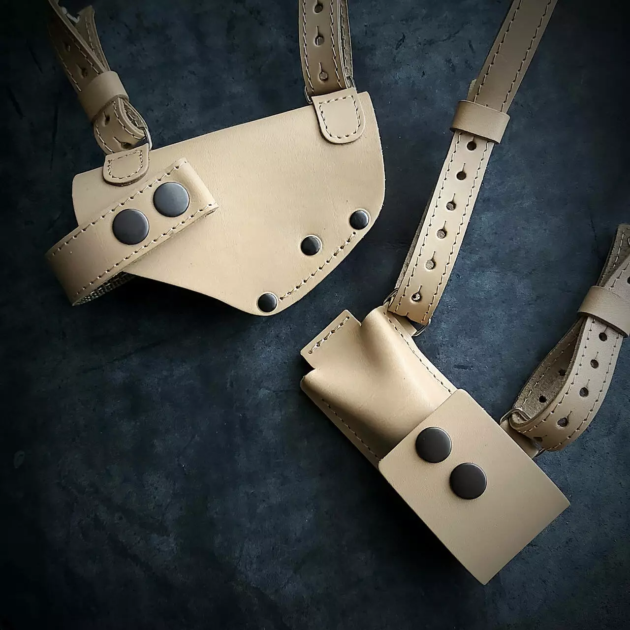 - Кобура ліворуч, паучер праворуч. Кобура і паучер знімаються з наплічної системи і можна носити на ремені шириною 5 см.