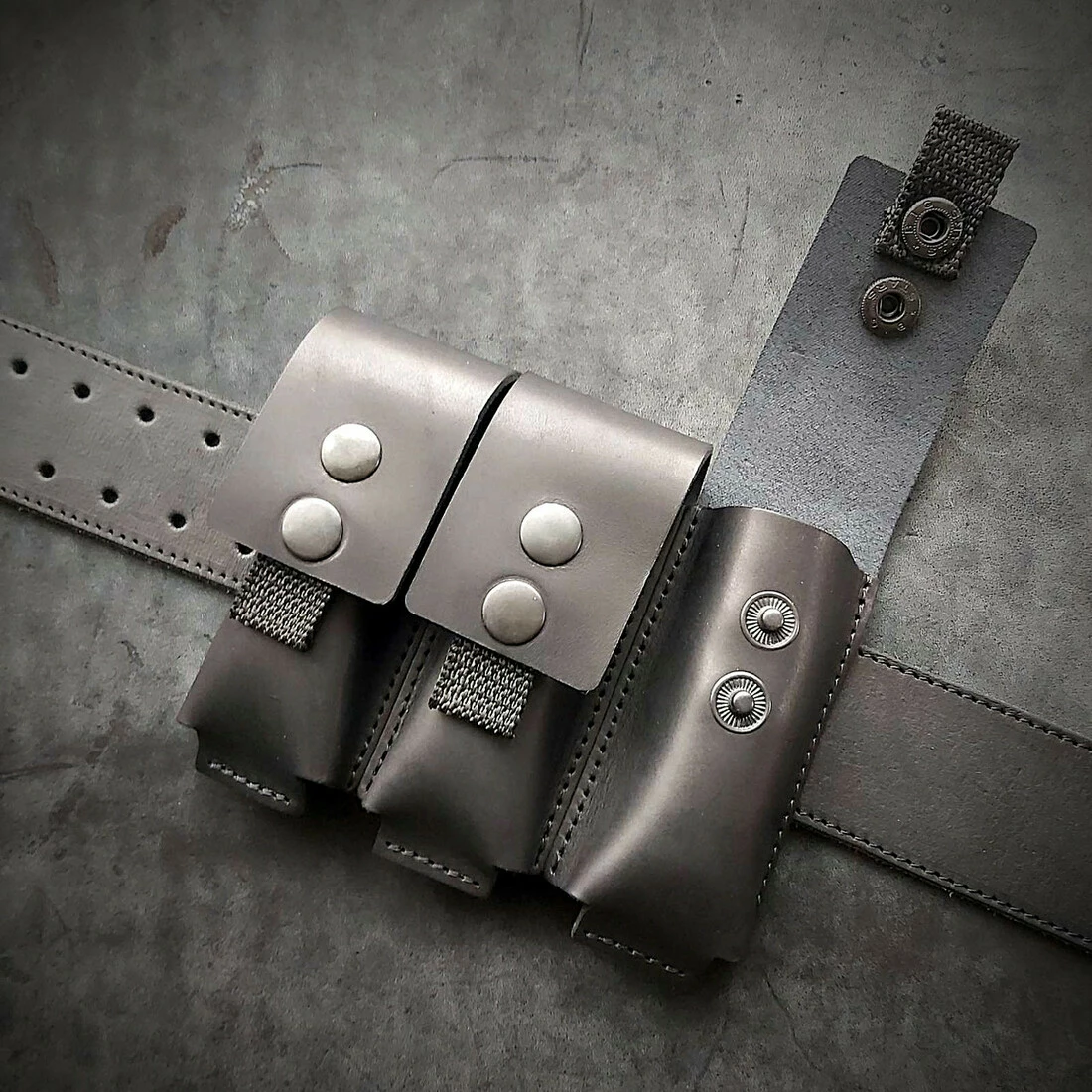 Паучер (підсумок) під магазин ПМ на три відділи. Виконаний із натуральної щільної шкіри під ремінь 5 см завширшки. Колір чорний