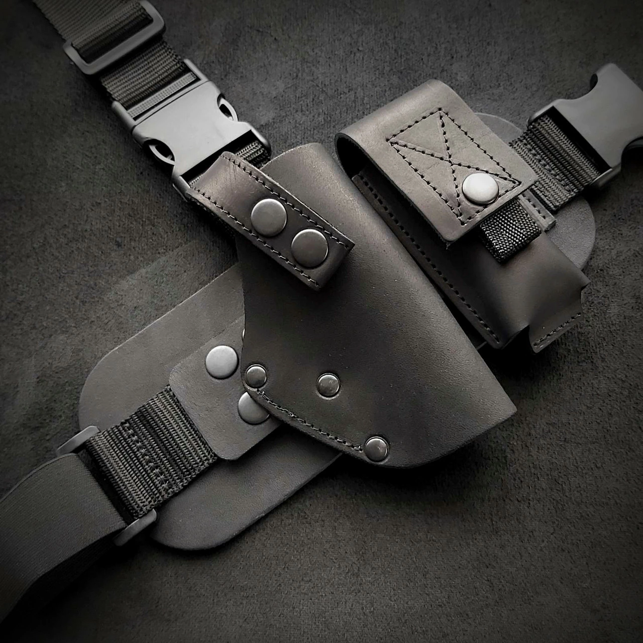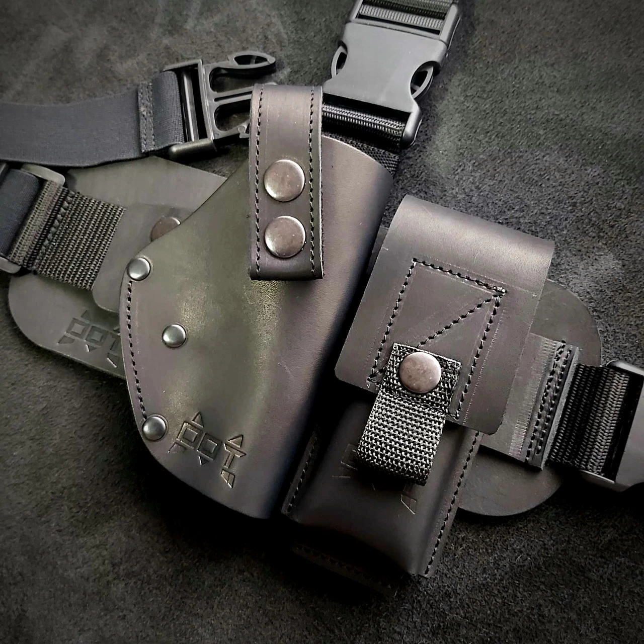 Кобура на стегно під ТТ. Колір чорний Виконана із натуральної шкіри. Кобура та паучер зі шкіри завтовшки 2.5 мм, підкладка з ремінної шкіри 3.5 мм завтовшки. Кобура та паучер знімні, можна носити на ремені. Кріплення на ремінь 5 см завширшки. Підкладка фіксується на стропі зверху та на гумці збоку. Стропа, гумка, фастекси міцні. Ширина фастексів 4 см Підкладка регулюється по вертикалі та горизонталі. Кобура не бовтається, сидить щільно. Виробництво Україна, робимо під праву та ліву руку