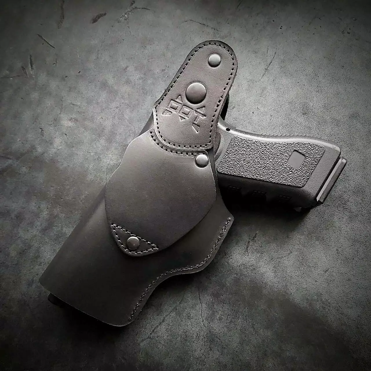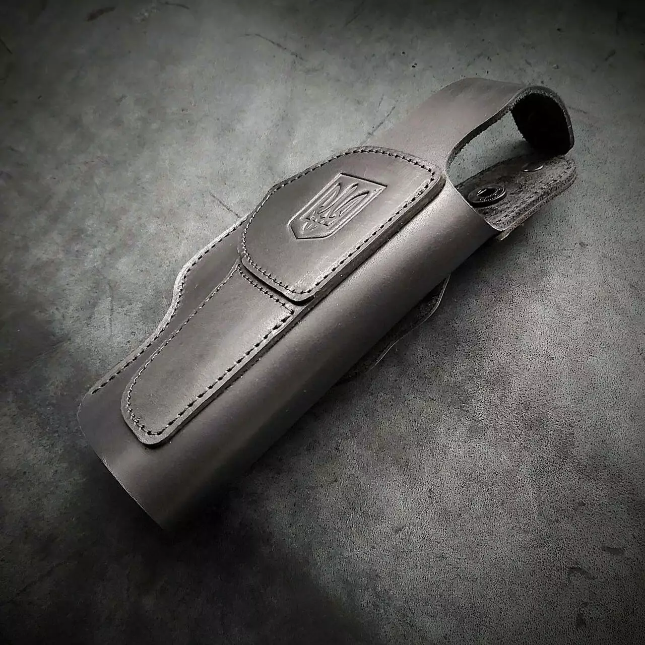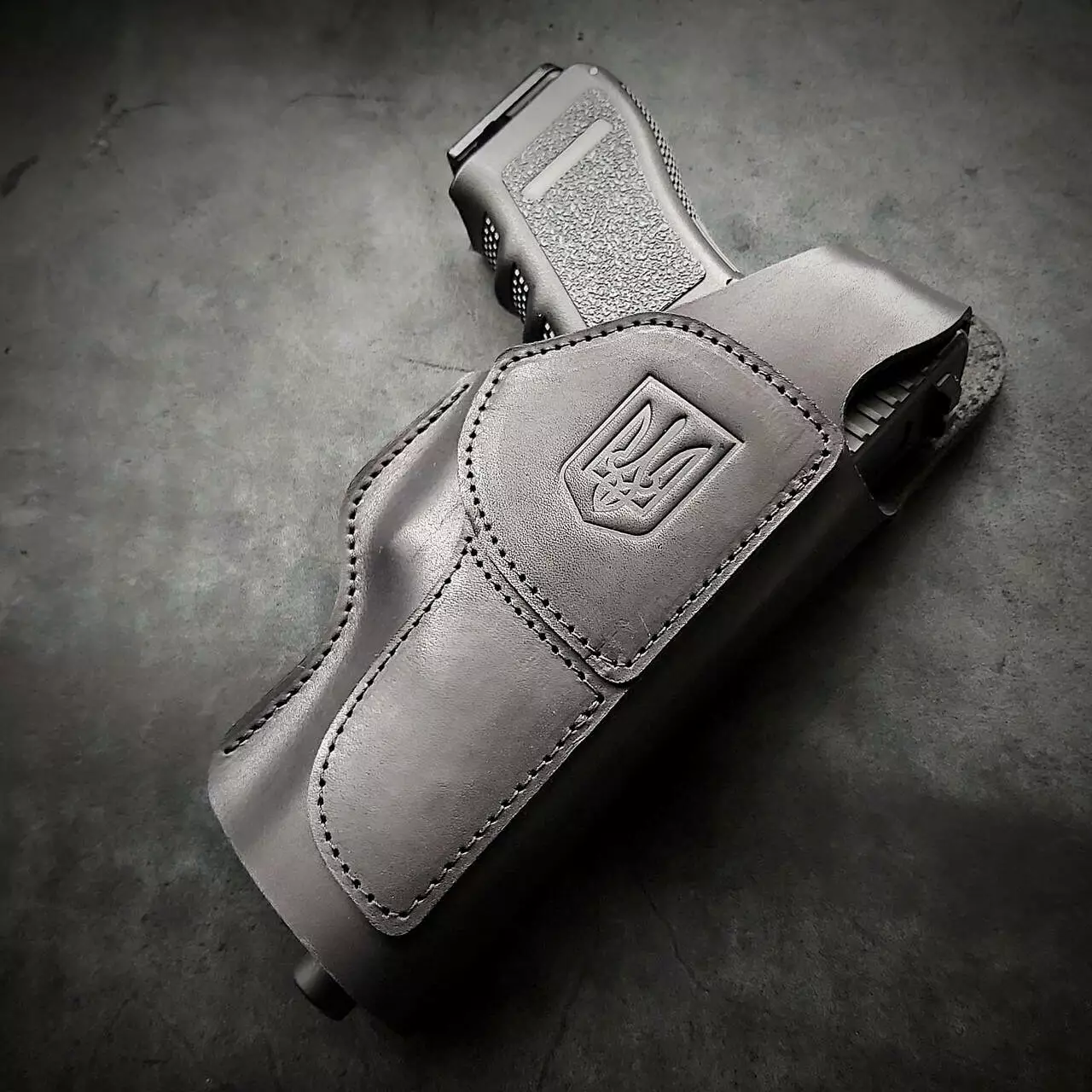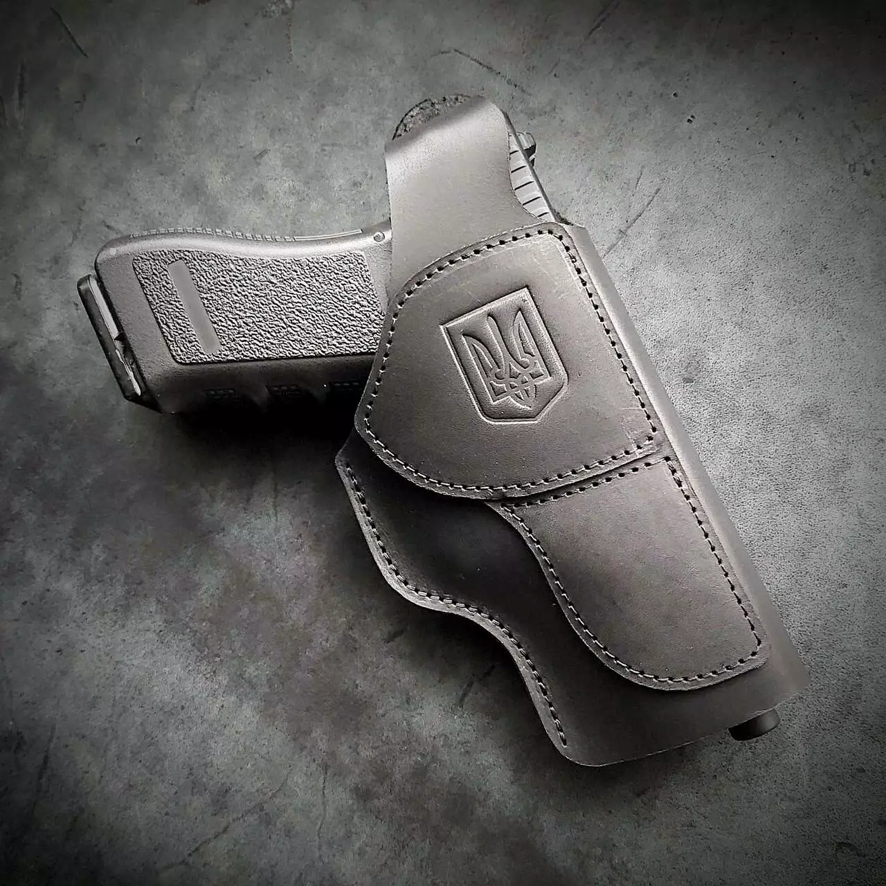 Шкіряна кобура поясна під GLOCK 17, чорна з тисненням герб України