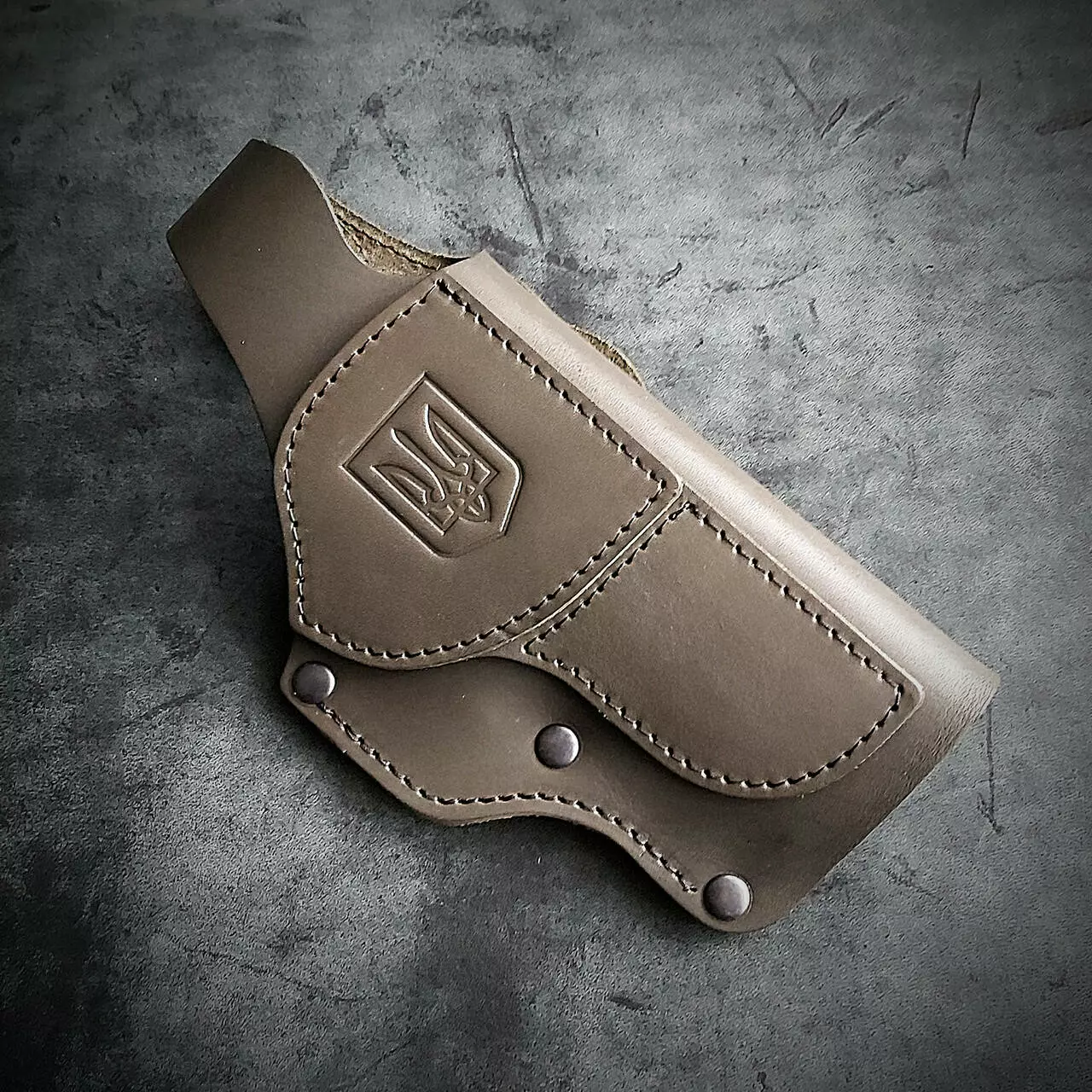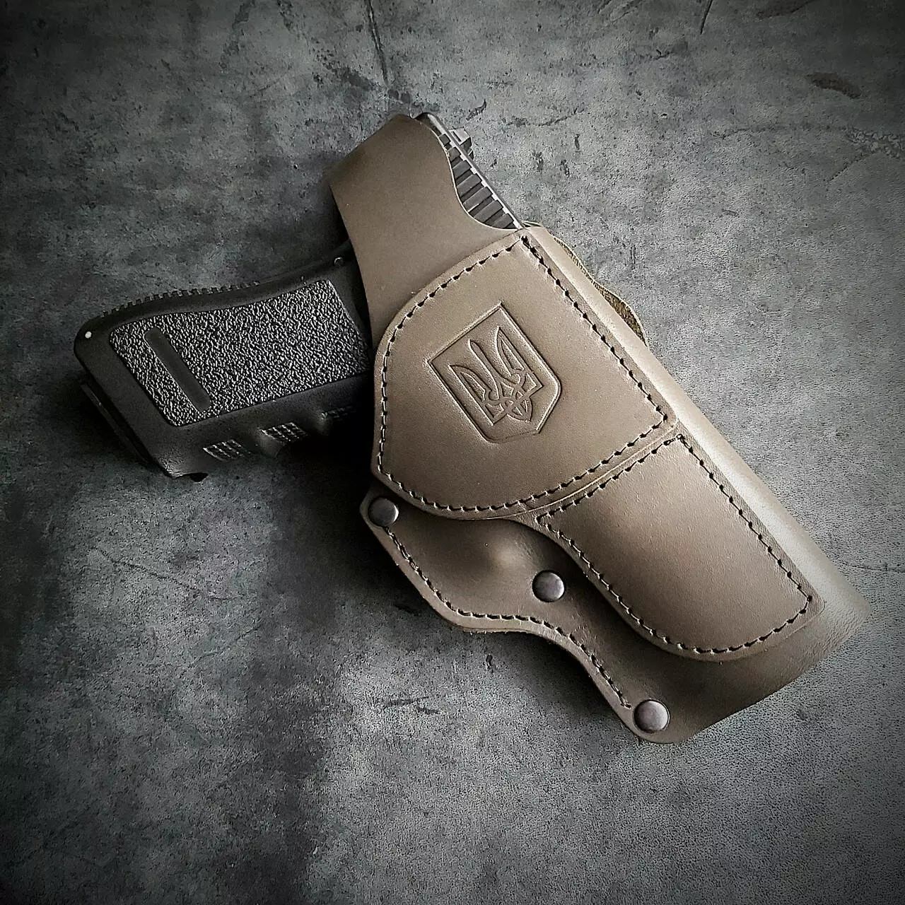 Кобура поясна під GLOCK 17 виконана із щільної натуральної шкіри із тисненням герб України. Колір олива