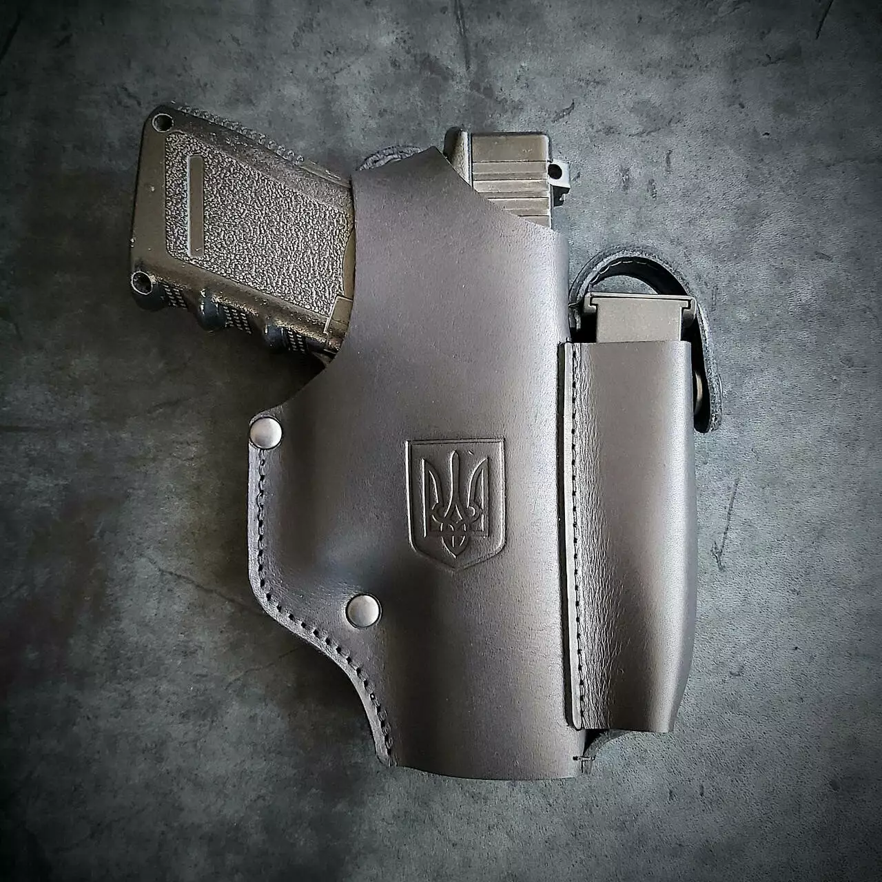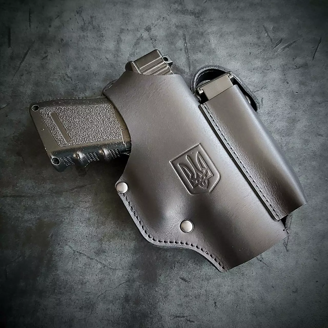 Шкіряна кобура поясна під Glock 19 | чорна з гербом України