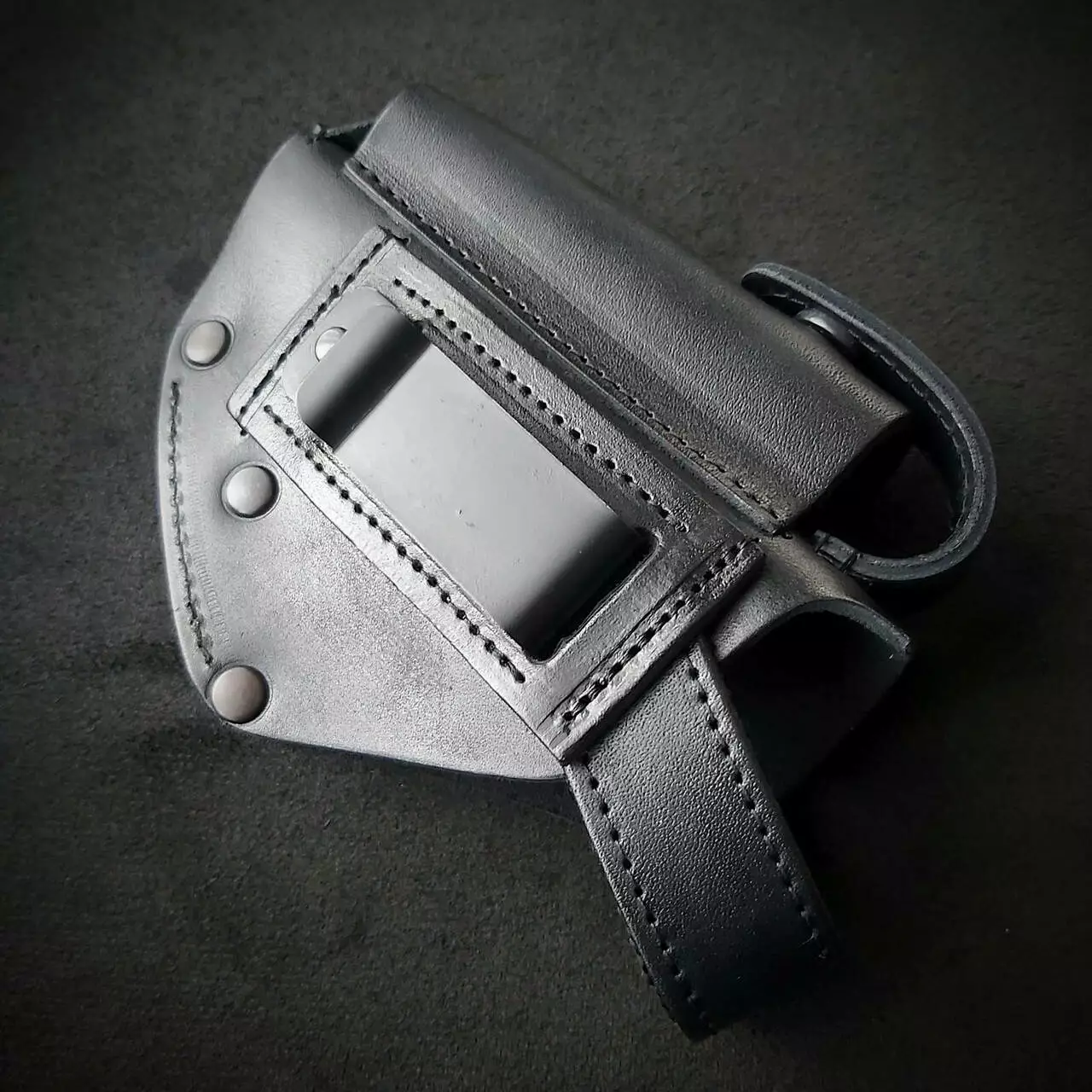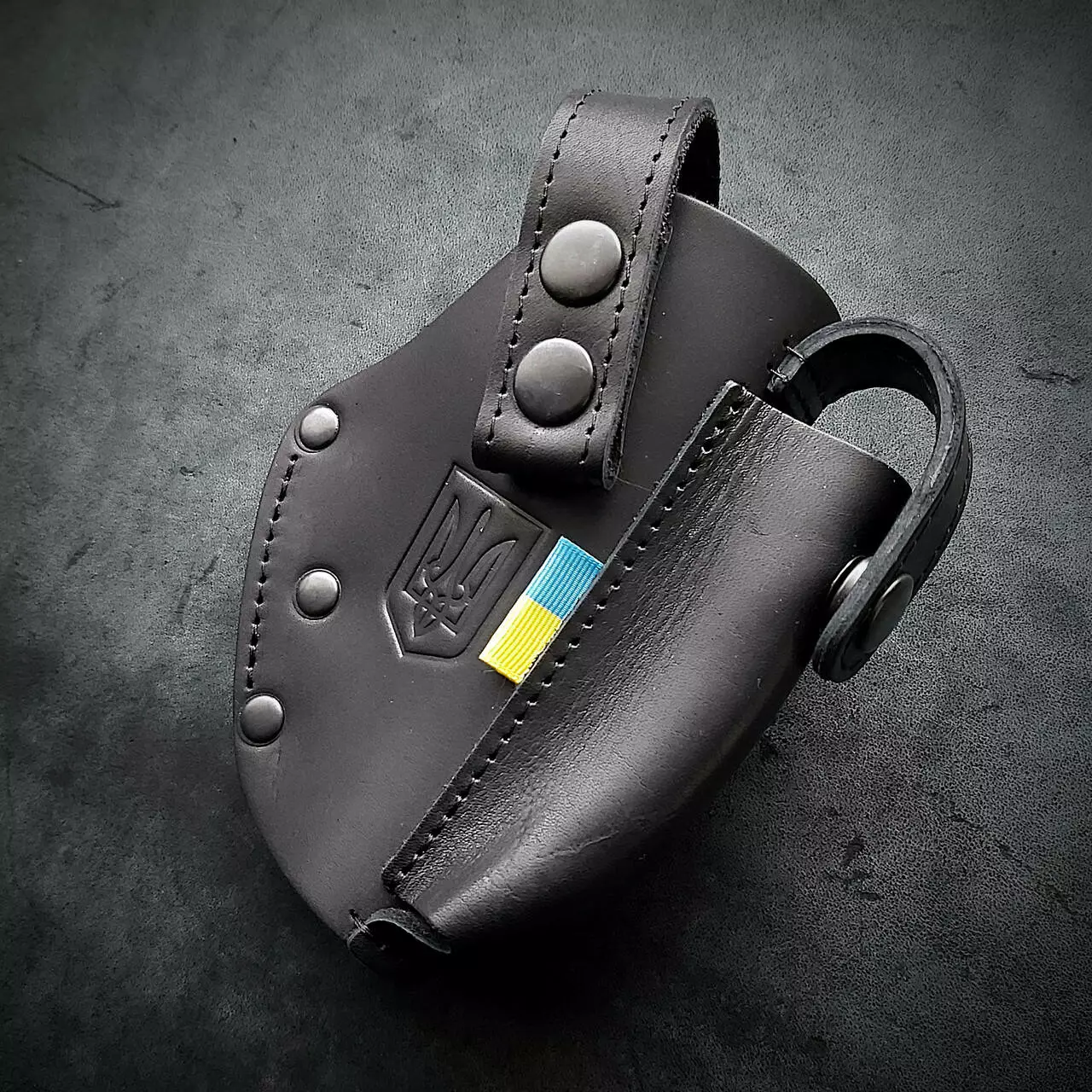 Кобура поясна під ПМ з героб та прапором України. Виконана із щільної натуральної шкіри 2.5 мм завтовшки. Колір чорний