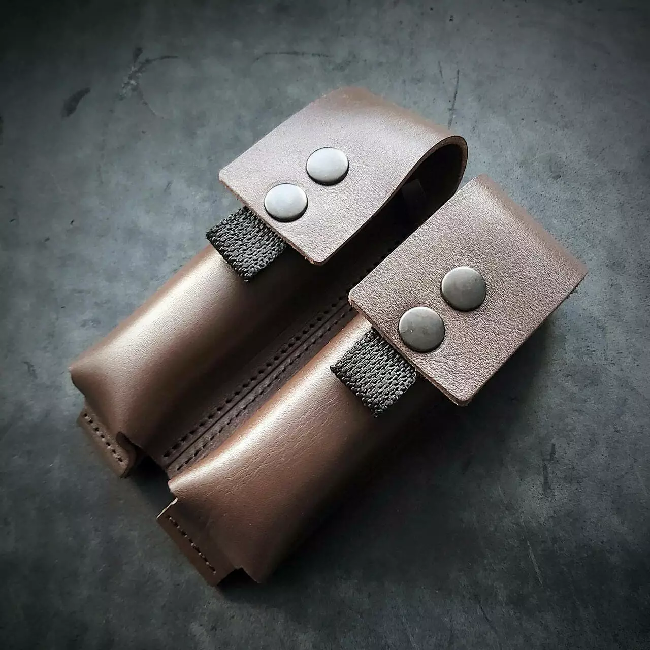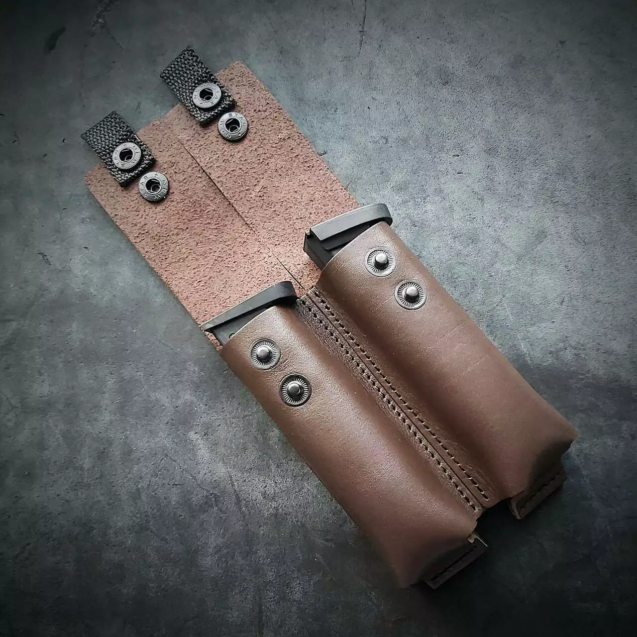Подвійний паучер (підсумок) під магазин ПМ. Виконаний із натуральної щільної шкіри під ремінь 5 см завширшки. Колір коричневий